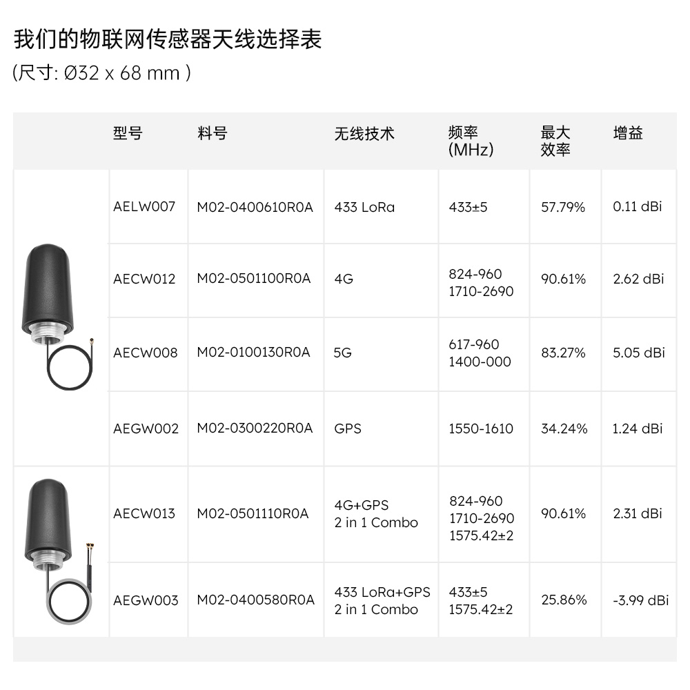 | AECW012 | 4G 频段物联网传感器天线 | M02-0501100R0A | 支持定制 |