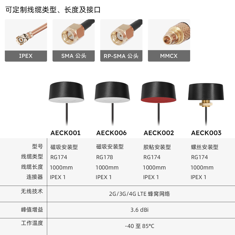 | AECK001 | 磁吸安装型,IPEX1,1000mm RG174电缆 | M02-0500210R0A | 支持定制 |