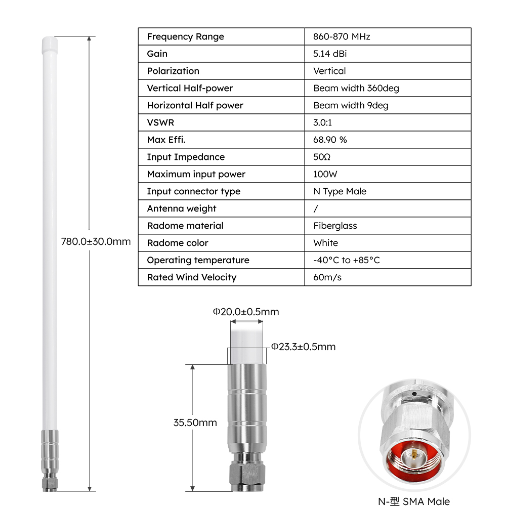 | AELF002 | 860-870MHz 5.14dBi玻璃钢天线(φ23.5 x 780mm) | M02-0400300R0A | 支持定制 |