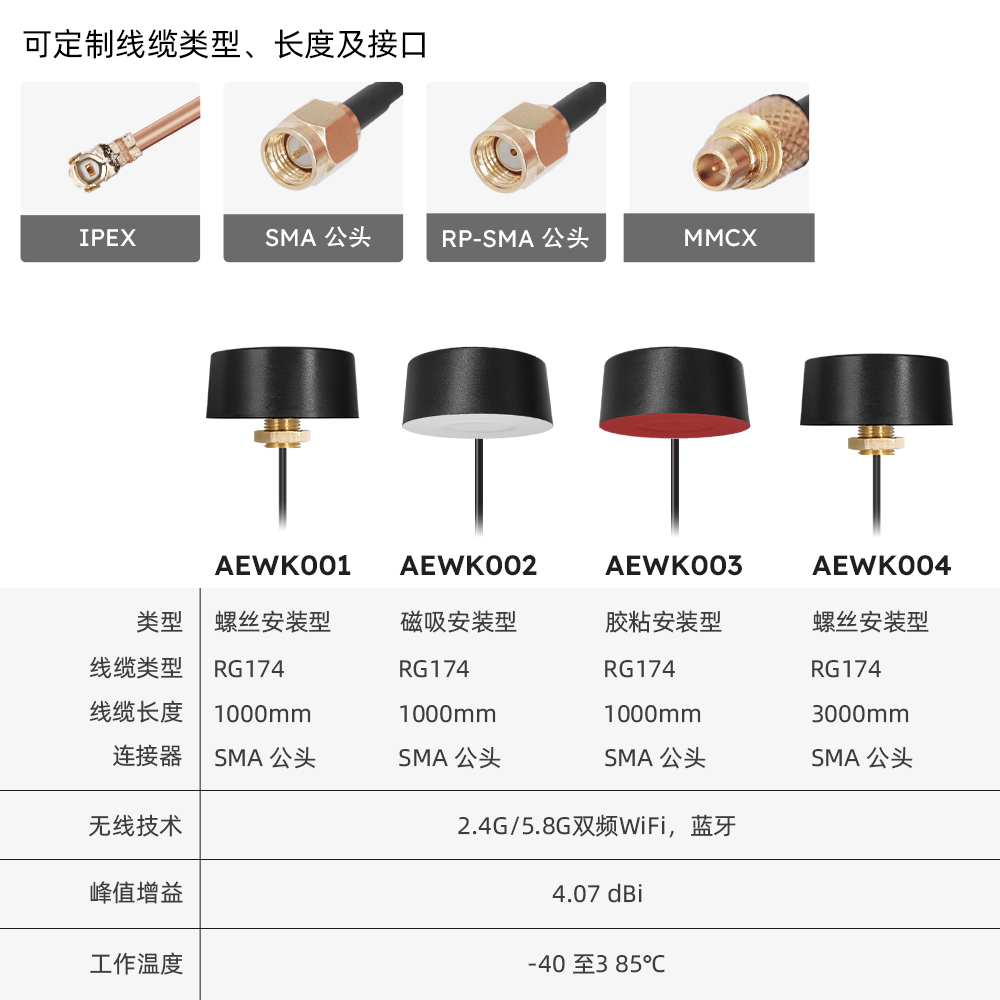 | AEWK001 | 2.4/5.8G机柜天线-1m线长RG174 螺丝款 | M02-0200120R0A | 支持定制 |