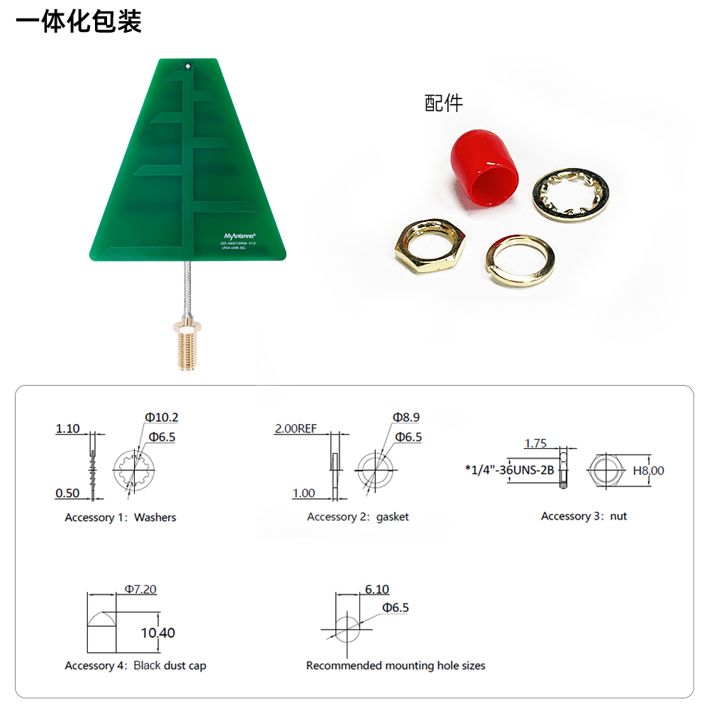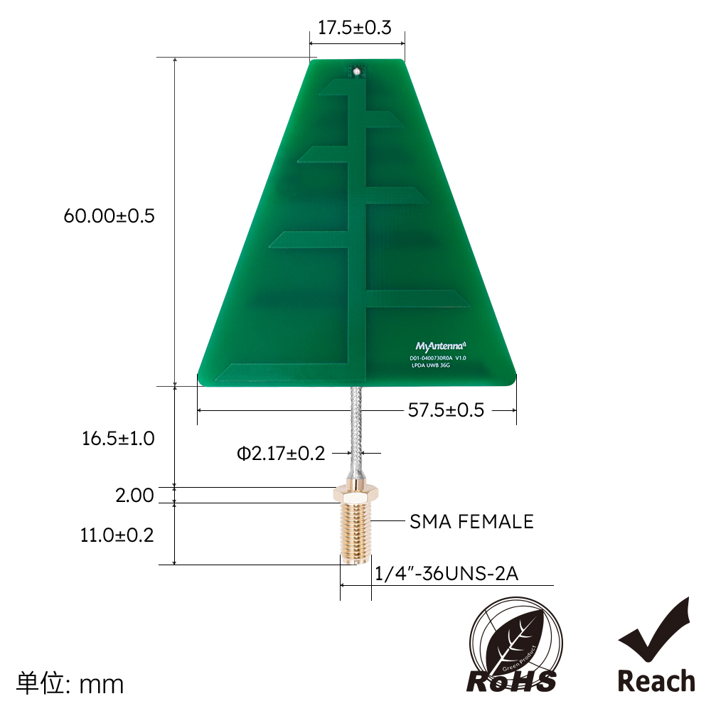 57.5*60*1.6mm PCB天线 Φ2.17*16.5mm 电缆 SMA母头 (绿色款) M01-0400800R0A