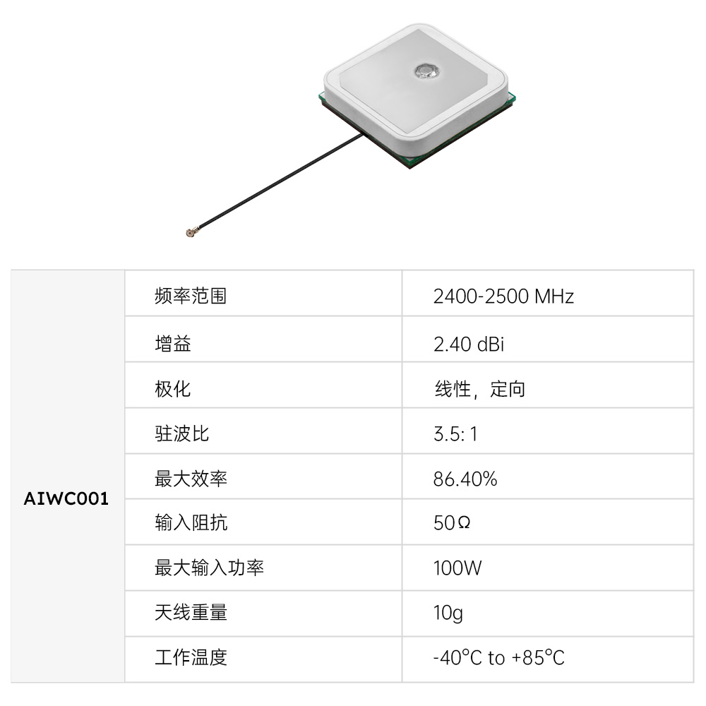 | AIWC001 | 25 x 25mm 2.4G WiFi陶瓷贴片天线 | M01-0601680R0A | 支持定制 |