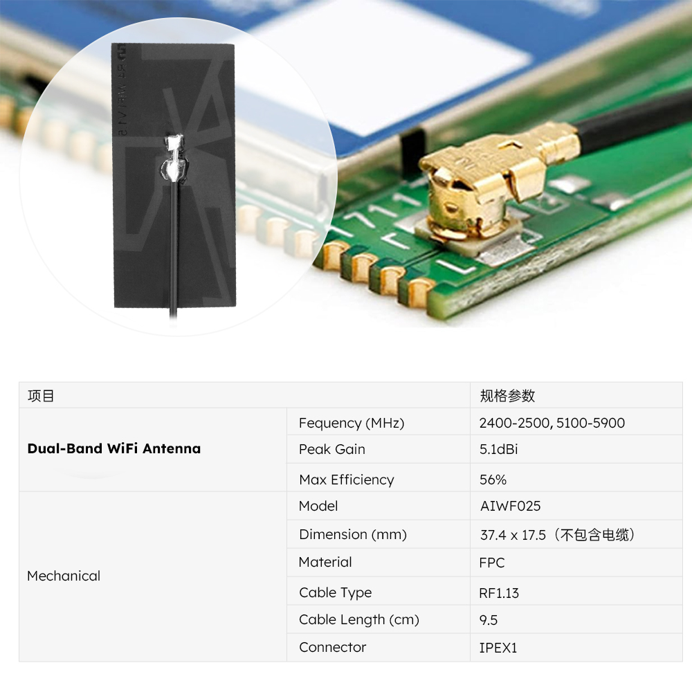 | AIWF025 | 2.4G /5G WiFi 胶粘式嵌入式 FPC 天线 37.4x17.5x0.2 mm | M01-0201580R0A | 支持定制 |